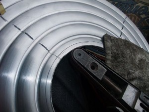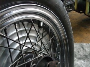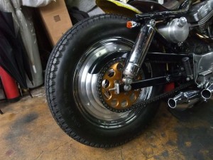 こんにちは! 念願のムーンディスクが装着完了し、先週はMotorcyce DenさんのA-Dayへ雨の中出展して来ました。 帰りも勿論、雨の中、自走!途中ではメガネが飛んでしまうハプニングも有りましたが、無事戻り、今週は何と!今、FTW出展の為、九州・熊本に来ております! この模様は次号をお楽しみにしていて下さいね! そででは、写真が多いですが、ムーンディスクの加工・装着を御覧ください! まずはムーンディスクをMOONEYESで購入してくださいね! Call us!!045-623-5999 次に、装着するホイールのセンターハブ径を計ってください。 センターを空ける部分にしるしを付けたら、旋盤なり、僕みたいにハンマーでアルミを叩いて行きますと、その部分が薄く突起し、カッターでも切れるようになります。 どうしてもカッターですとギザギザになってしまいますので、綺麗に磨いで見ました。 エアーバルブの逃げも忘れずにカットしてくださいね! 僕は4箇所のビス止めにし、勿論、ホイールの間にはスリーブを入れています。 こうやって、スリーブをスポークに挟んで置けば、ずれにくくなると思います。 とこんな感じで、無事装着完了出来ました。 今週はクールブレーカーに展示しており、普段はMOONEYES Area-1に置いておりますので、見に来て下さ~い! それでは! また来週!!